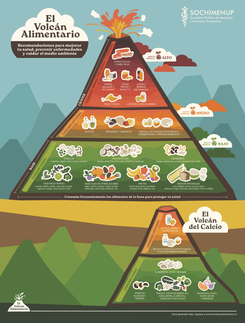 El Volcán Alimentario es una guía alimentaria para Chile, que integra la alimentación con la salud humana y el medio ambiente, acorde con el marco conceptual de Salud Planetaria adaptada a nuestro país.